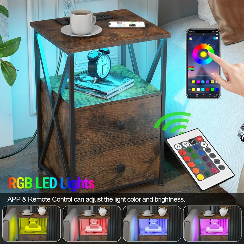 - Night Stands with LED Lights: This nightstand set of 2 for bedroom comes with color-changing LED light, giving thousands of colors, more than 20 speed modes and about 100 brightness. They’re controlled by remote control or APP. It can also flash to musical rhythms.