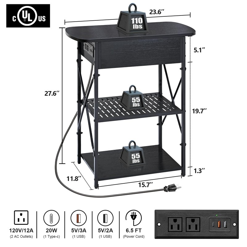 - One-stop Charging Station: With 2 AC Outlets, 2 USB and 1 Type-C ports and 6.5 feet cord, this charing side table allows 5 devices to be charged simultaneously. The charging station sets on the side of the table, will not occupy the drawer storage space, and avoid electrocution caused by spilling liquids.