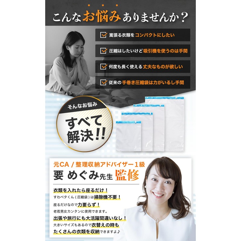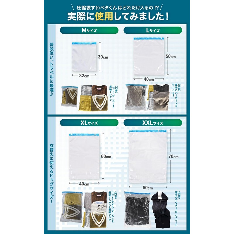 • ✅【Just sit on top. Compresses in Just 5 Seconds: With LIXIA Suwapeta-kun, you can transform bulky clothes into approximately 1/2 - 1/4 size by simply sitting on the top of the bag. Enjoy your trip that won't be impacted by your luggage with LIXIA compression bags!