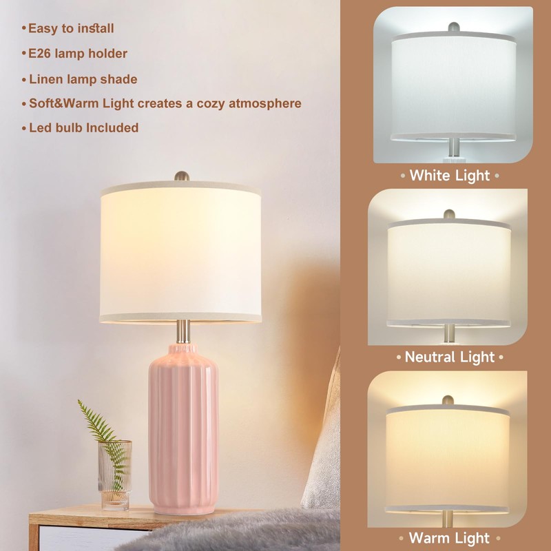 Liyicha Lamps for Living Room Bedroom Lamps Farmhouse Table Lamps Set of 2 Vertical Stripe Ceramic Table Lamp,Linen Shade with Bulb, 25 in High, Pink