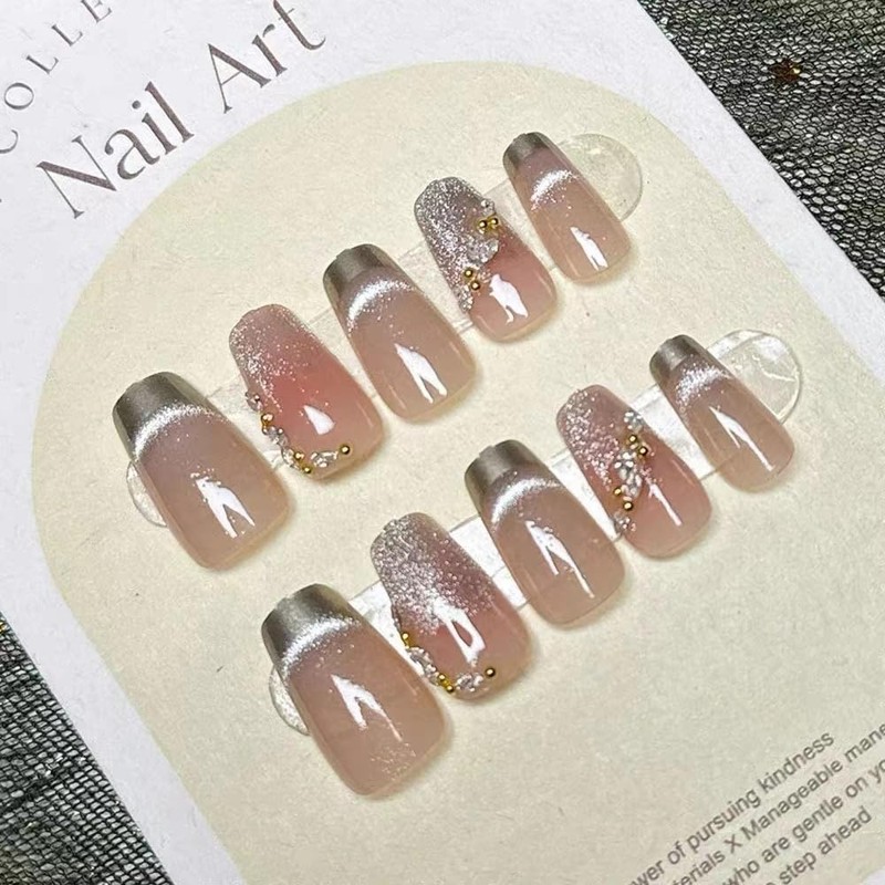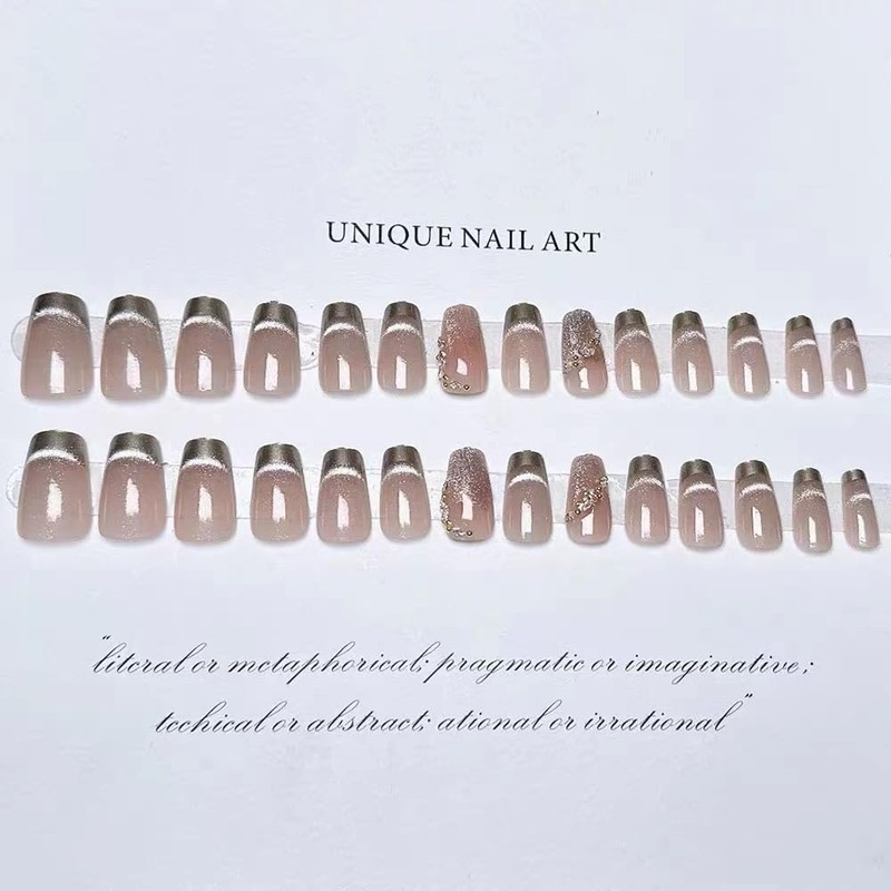 LIyun&Hang Press on Nails Medium-length 24Pcs Glossy Full Cover Artificial Fake Nails,Wheat-ear rhinestones and French Tip Cat Eyes Flashing Design, Reusable Stick On Nails in Fake Nails (type-2)