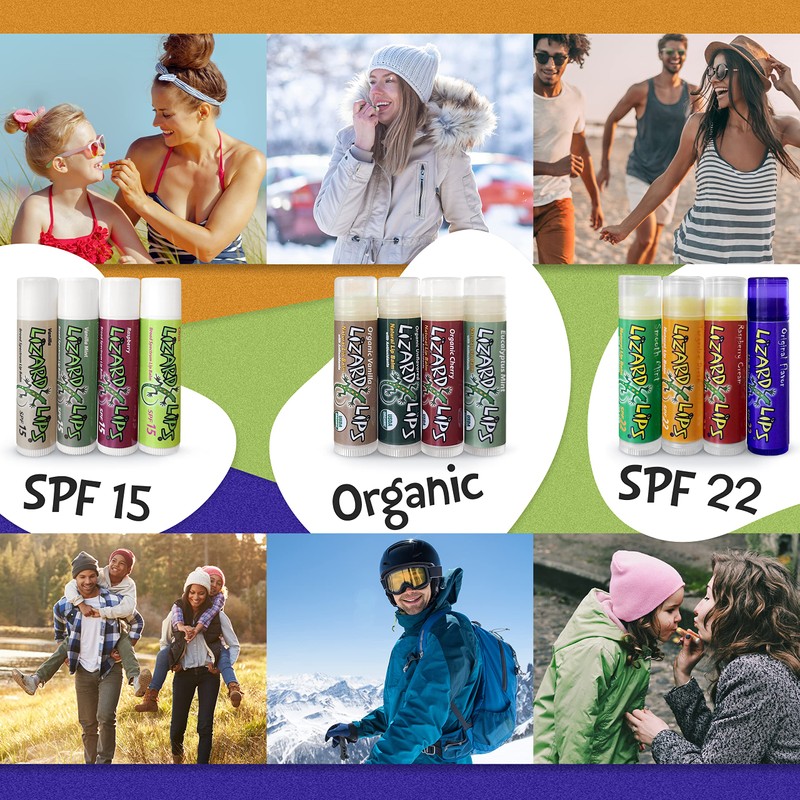 Lizard Lips SPF 22 natural base lip balm is perfect for every adventure. Unlike most lip balms that just simply cover up your lips, Lizard Lips protects against sun, wind & cold. Our petroleum-free formula hydrates & heals with Aloe, Comfrey & Sage; and revives & relieves overexposed, stressed lips with Shea Butter, Sal Butter, Vitamin E & Grape Seed Oil. Don't just cover up your lips – heal, moisturize and protect them with Lizard Lips!
