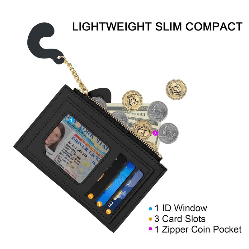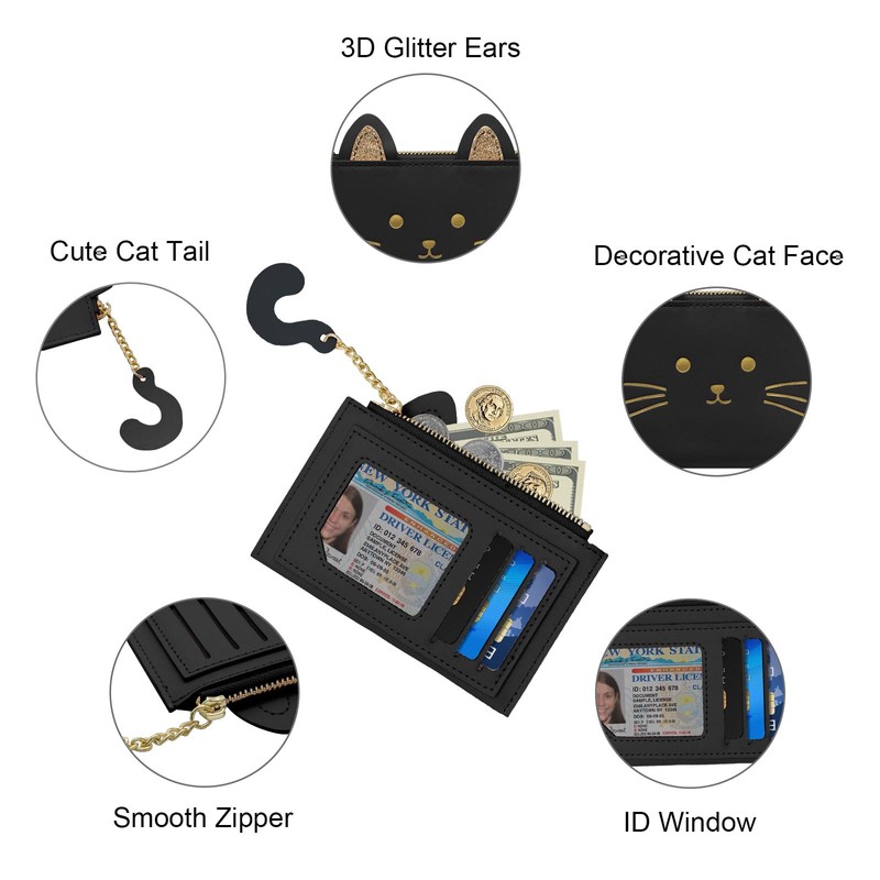 LJCZKA Cat Credit Card Holder for Women Small Cute Wallet Slim Zip Card Case Change Wallet with ID Window, black, Minimalist