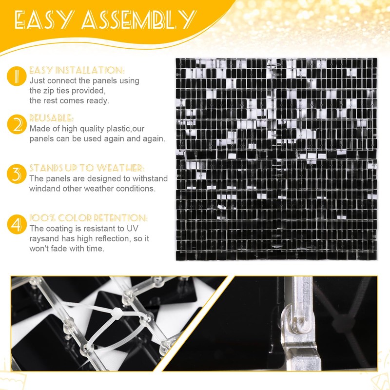 - EASY-TO-INSTALL: Shimmer sequin wall panel backdrop is super easy to set-up and offers hassle-free experience. Each panel comes pre-assembled, just only align it on two sides with the buckle and fasten it directly. Then match shimmer wall panels with invisible nail hangers or cable zip ties and mount it wherever you wish. If there is a stain, it can be cleaned with just a paper towel or washcloth dampened with water.