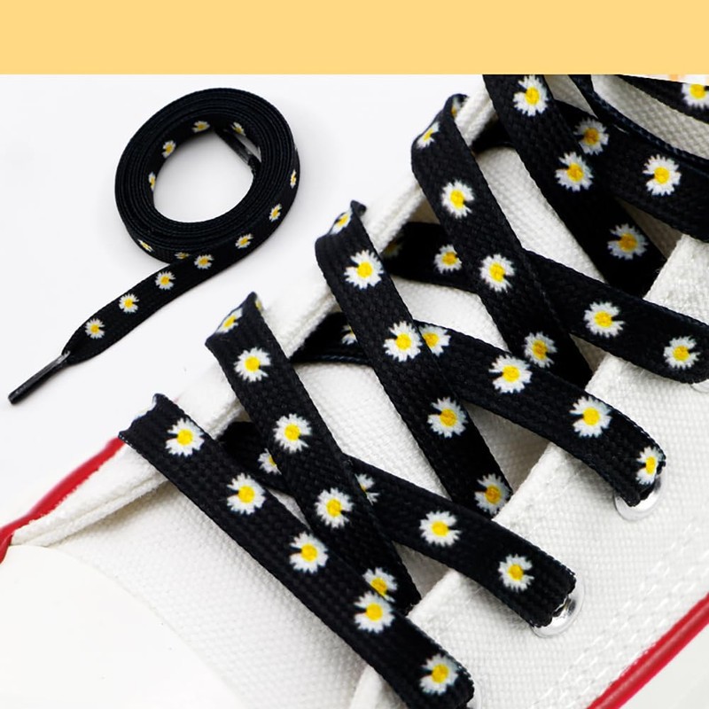 - With novelty designs and bright color prints, these different colored daisy-designed laces are perfect for canvas shoes, low and high-top converse, white shoes, boots, and skate shoes, and also give your sneakers a perfect character.