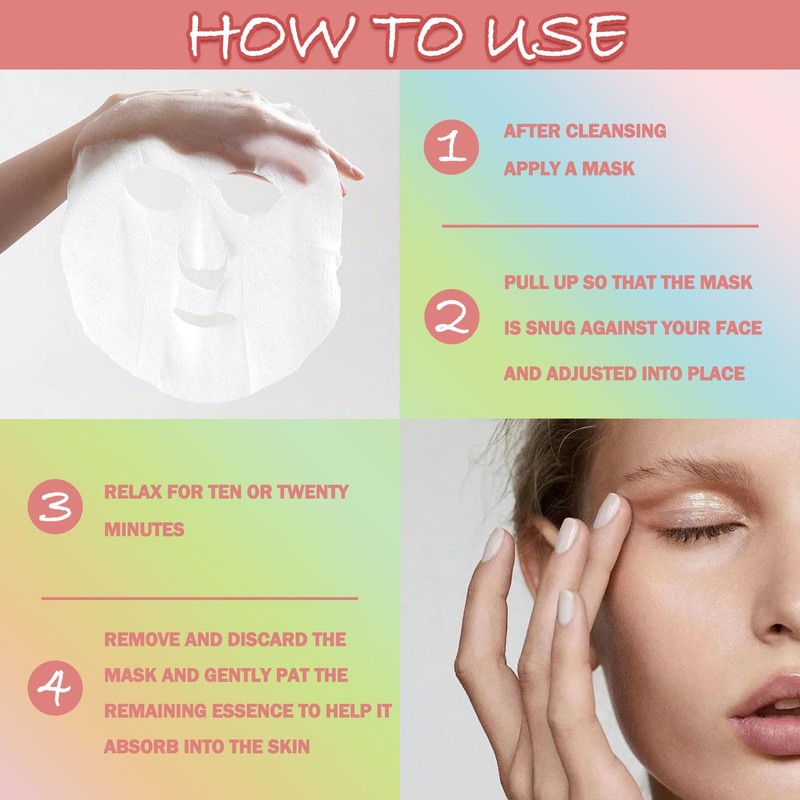 • ❤️【Easy to Use】Tear open the package and put the sheet mask on your face, wait 15-20 minutes to remove the mask and gently pat your face until absorbed, no need to wash your face again.