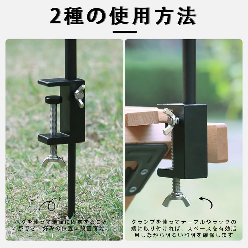- (2 Types of Use) 2-way style that can be used on both ground and table. You can use the pegs to fix it to the ground and place it in your preferred position. Attach to the edge of a table or rack with the clamp to ensure bright lighting while utilizing space