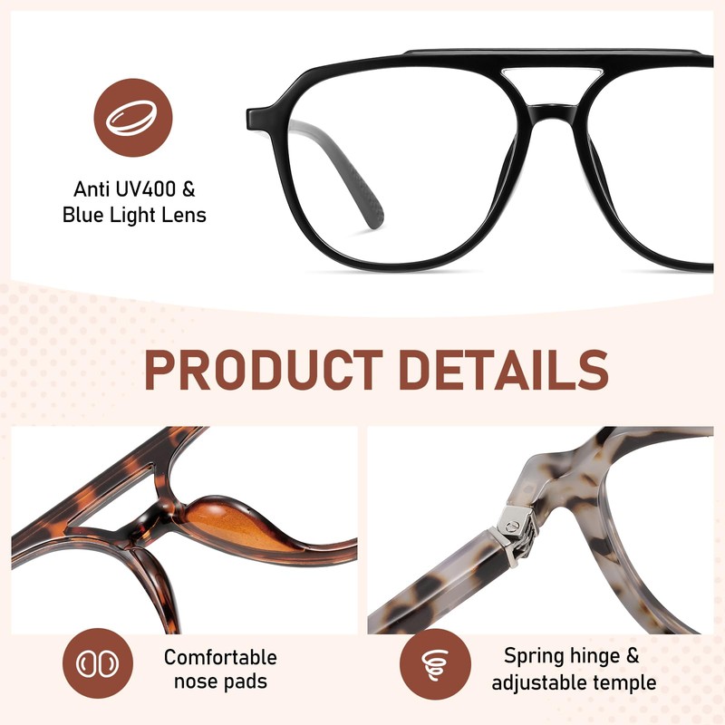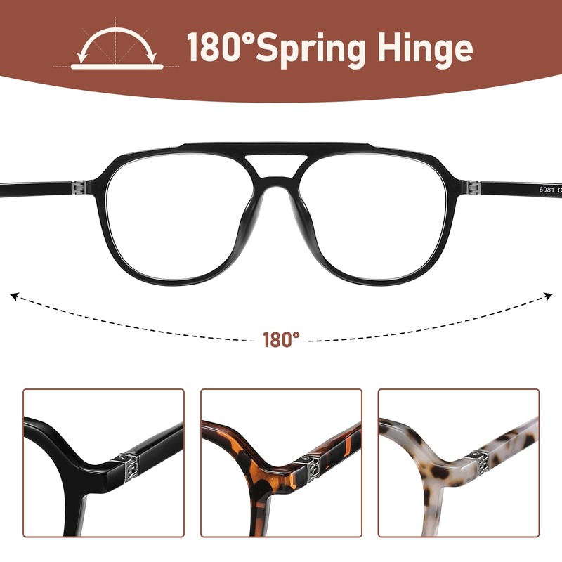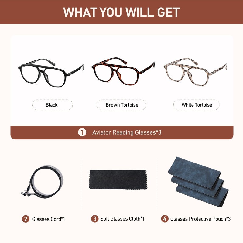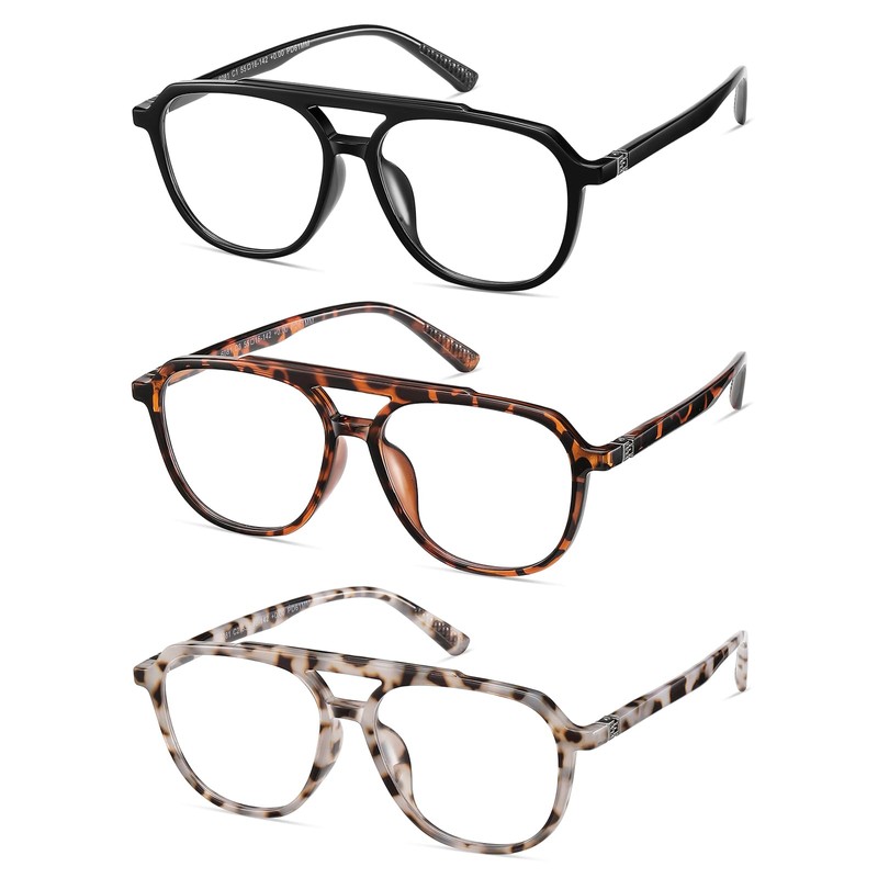 • 3 PACK AVIATOR STYLISH READERS:Oversized blue light reading glasses have a black, White tortoiseshell, and brown tortoiseshell color suitable for all kinds of women and men's faces. Different colors give you a fresh look and adapt to different situations 3Packs of stylish readers for different places: 1 pair of big reading glasses used at home, 1 pair of aviator reading glasses used in the car, and 1 pair of large reading glasses carry with you. The most convenient eyewear combo set.