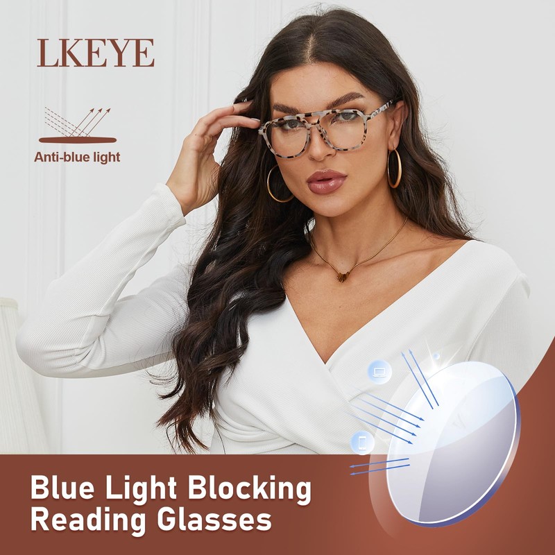 • ANTI-BLUE LIGHT & UV400 PROTECTION:Anti-scratch blue blocker fashion aviator oversized reading glasses with UV400 protection, effectively resist harmful blue rays. Stylish readers for women and men allow you to stop changing between blue light glasses and reading glasses. LKEYE blue light glasses provide all-day protection. Reduce eye fatigue when you use digital products (TV/Phone/LED Light/Computer/pad)