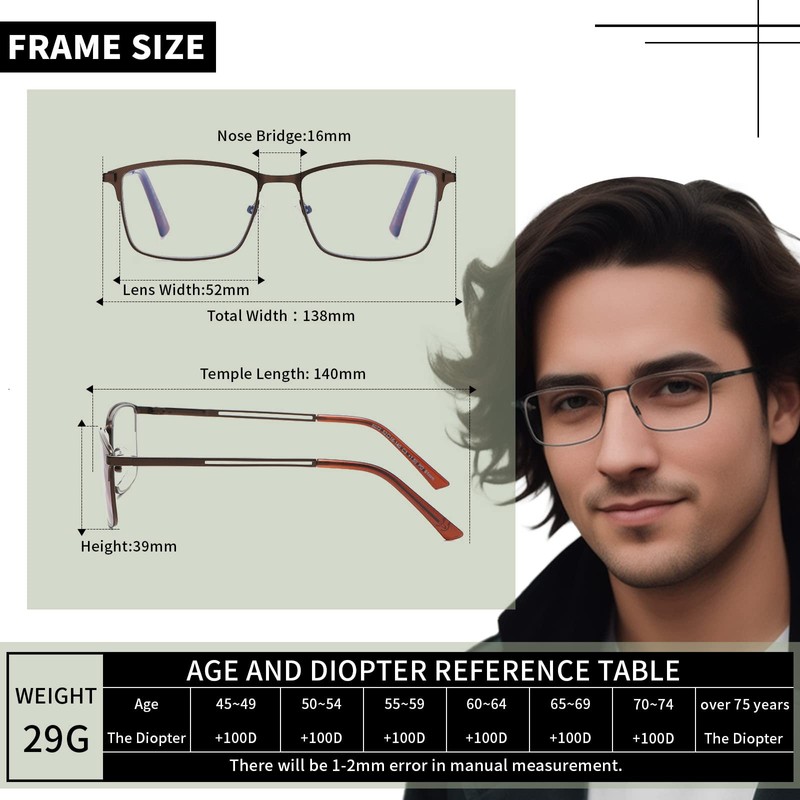 - LIGHTWEIGHT, UNBREAKABLE & COMFORTABLE:LKEYE Stylish rectangle multifocal reading glasses for men with the classic extra wide full wide frame, lightweight metal, durable spring hinge, Skin-friendly & allergy-free soft silicone nose pads can reduce the burden on your nose and allow for maximum comfort. Flexible and unbreakable multifocus reading glasses frame suitable for people of all sizes of heads ( big head & small face)to wear for a long time. The best multi focus readers for men!