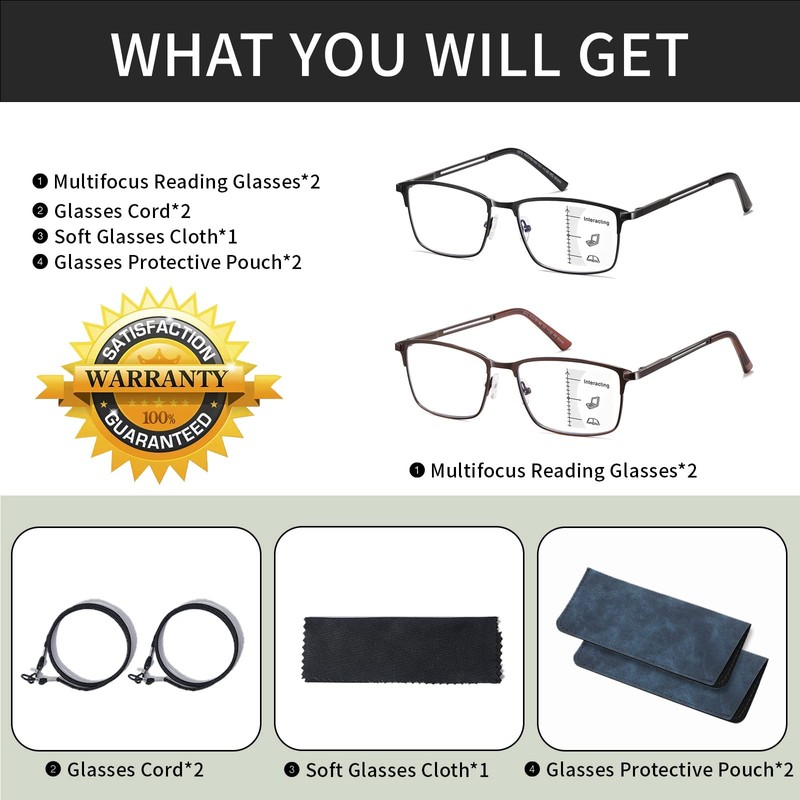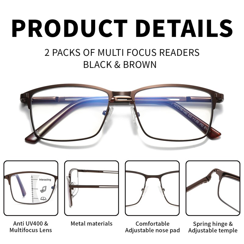 - WORRY-FREE SERVICE-SET OF PROGRESSIVE MULTI FOCUS READING GLASSES:Please feel free to contact us if there is any problem with the progressive multifocal reading glasses for men, and we will give you a satisfactory solution without hesitation. No risk to trying! You will receive Blue light rimless multifocal reading glasses*2 +2.50 strength (Black & Brown), Glasses Cord*2, Microfiber glasses cleaning cloth*1, and Glasses pouch*2.Best gifts for men!