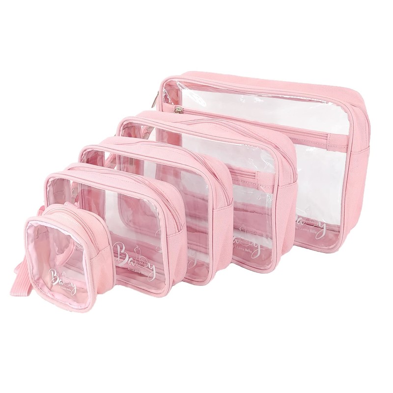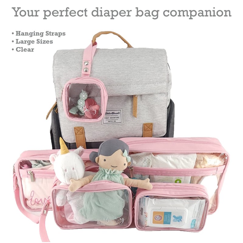 Llama Bella 5 Piece Diaper Bag Organizer Pouch Set, Clear with Straps and Pacifier Case - Pink
