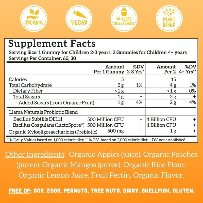 Llama Naturals Llama Naturals Kids Probiotic with Prebiotic Fiber, Vegan, Organic Prebiotics and Probiotics Gummies for Gut Health Support, Toddler Real Fruit Gummy Vitamins, No Added Sugar Cane, Peach Mango, 60 Ct