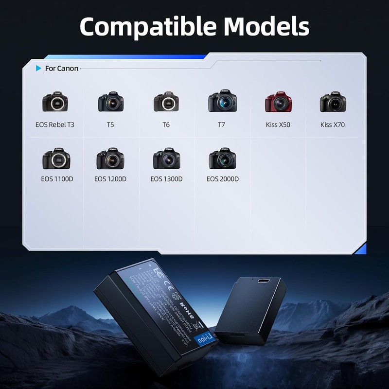 • Wide Compatibility & Full Decoding: llano LP-E10 battery is 100% compatible with Canon EOS Rebel T7, T6, T5, T3, T100, Kiss X50, Kiss X70, EOS 1100D, 1200D, 1300D, and 2000D models.Fully decoded for accurate power display, no pop-up warnings or firmware errors. Works just like the original LP E10 battery.(Note: Not compatible with T7i, T6i, or T3i models)