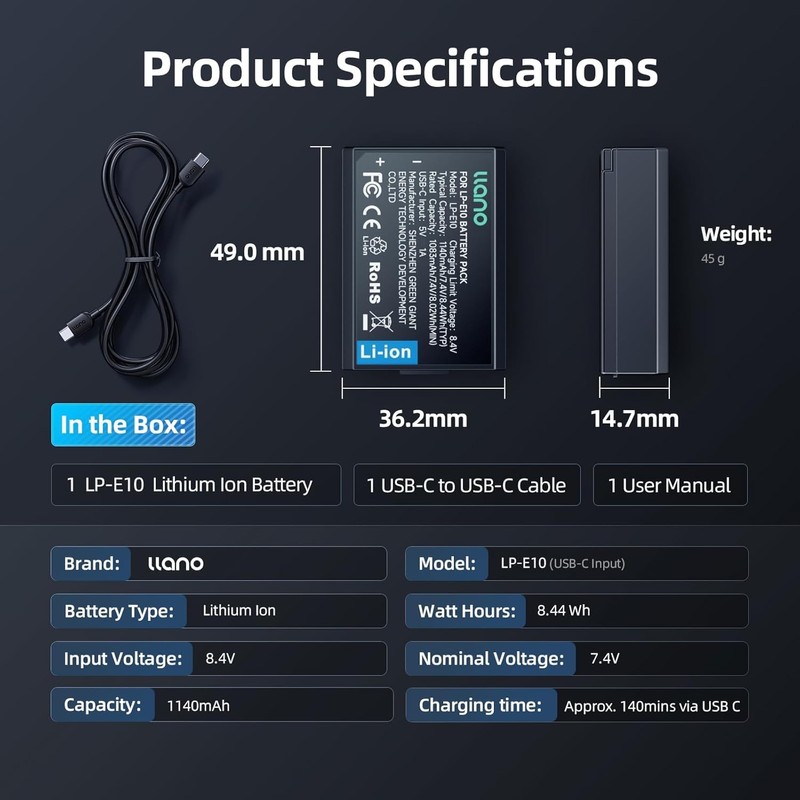The llano LP-E10 USB-C replacement battery offers reliable, fully decoded power for Canon EOS Rebel T3, T5, T6, T7, Kiss X50, Kiss X70, EOS 1100D, 1200D, 1300D, and 2000D cameras. With direct USB-C charging, you can power up anytime via wall adapter, power bank, or car charger—no bulky charger needed. Built with real capacity cells and full compatibility, it ensures accurate power display, stable performance, and essential protection against overcharge and overheating, making it the ideal choice for everyday shooting or travel.