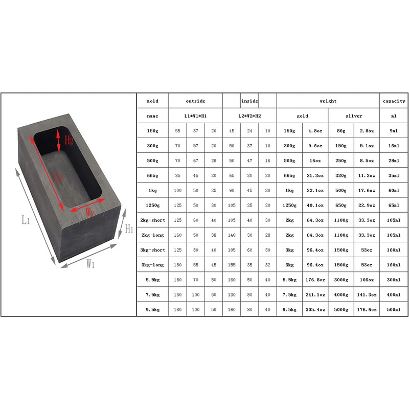 LLF Gold Silver Graphite Ingot Mold Mould Crucible for Melting Casting Refining (180x55x45MM(3kg Gold / 1.5kg Silver))