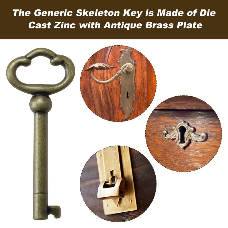 [Product Material]: Generic skeleton keys are made of die-cast zinc with antique bronze luster surface, making them sturdy and durable. The fancy bow handle looks more artistic and beautiful.