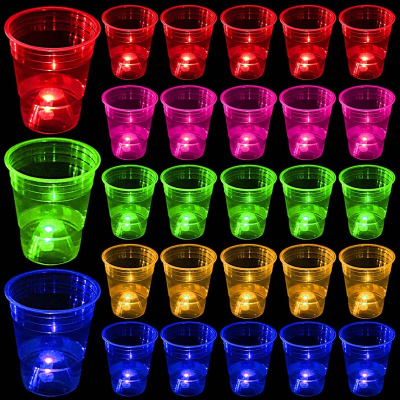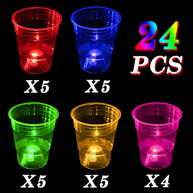- Light Up Party Cups: Includes 24 plastic cups, 24 LED lights (5 reds, 5 greens, 5 blues, 5 oranges and 4 pinks), 24 waterproof stickers.