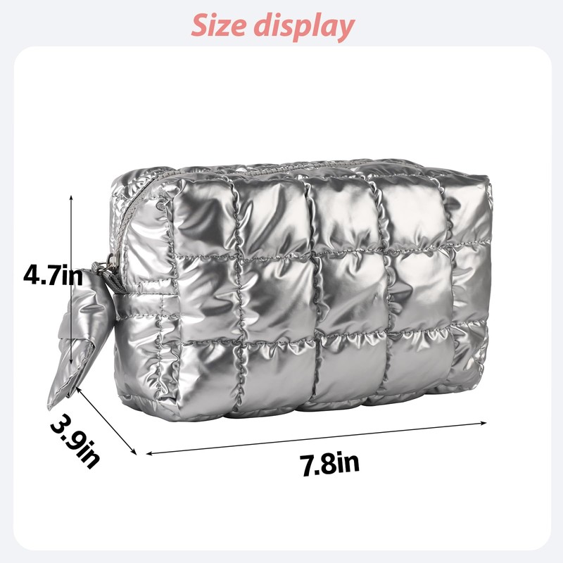 lllyan Quilted Puffy Waterproof Makeup Bag for Women - Large Capacity Travel Toiletry Organizer with Multi-Compartment & Plush Lining, Cute Portable Cosmetic Pouch for Daily/Trip Use, Silver