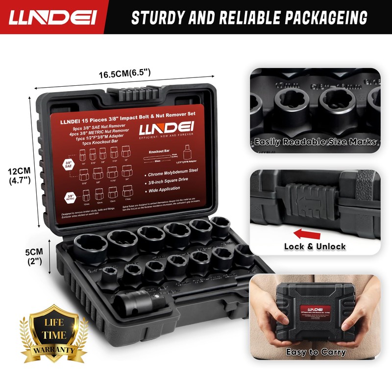 LLNDEI Bolt Extractor Kit, 15PCS Easy Out Stripped Lug Nut Removal Set with 3/8-Inch Drive, Heavy Duty CR-MO Steel with Adapter, Professional Mechanic Tools for Removing Broken Nut and Bolt