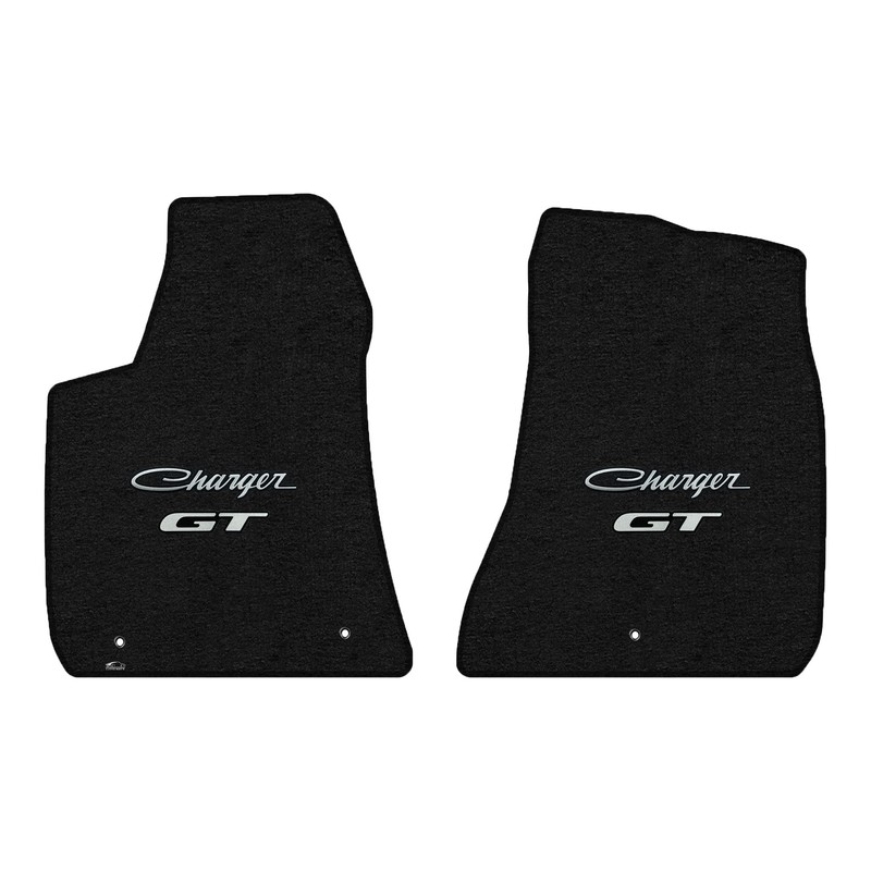 Lloyd Mats Heavy Duty Carpeted Floor Mats for Dodge Charger RWD 2018/ON - Silver Charger on Black + GT Logo (Charcoal, 2PC - Fronts)