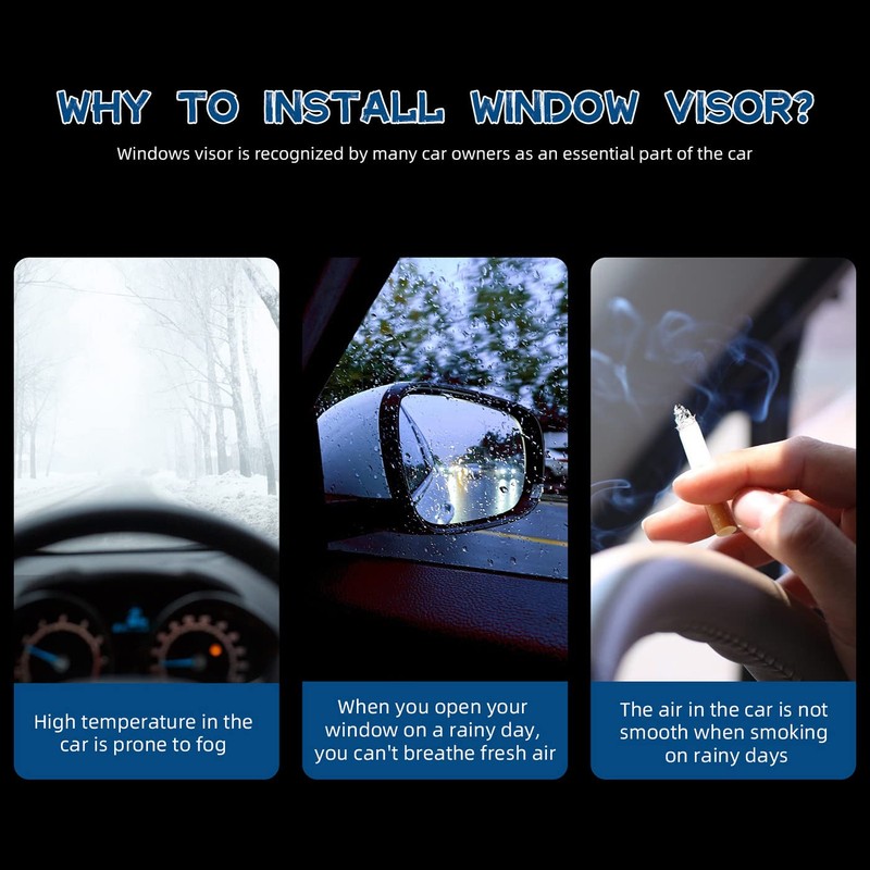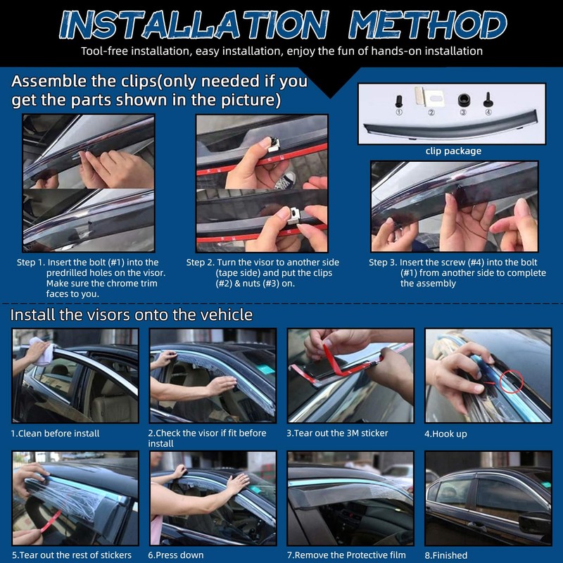 - Easy Tape-On/Clip On Design. Secure To The Window With 3M Tape & Clips (Included). No Cutting or Drilling Required. The clips need to be assembled yourself, please refer to the installation picture posted in the listing to see how to install the visors.