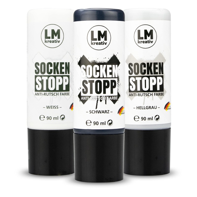 LM-Kreativ Sock Stop Anti-Slip Set – Black, White, Grey – Pack of 3 – ABS Anti-Slip, Sock Stop Cream, Liquid Sock Sole, Stops Slipping, Coloured Sock Stopper
