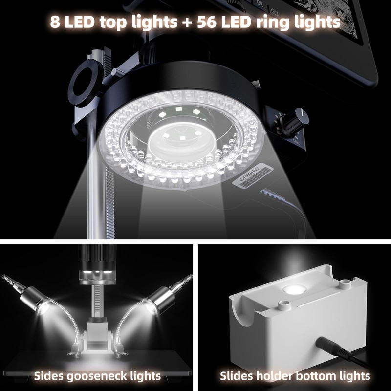 - 【Ring Light & Adjustable Illumination】With an upgraded external 56 LED ring light, 8 LED lights on the top, gooseneck LEDs on both sides, and an upgraded slide holder equipped with a bottom light, the LM208S 4K coin microscope offers adjustable lighting to highlight fine details, reducing glare and shadows for a clearer view, making it ideal for coin inspection or intricate repairs, and improving the quality of your photos and videos