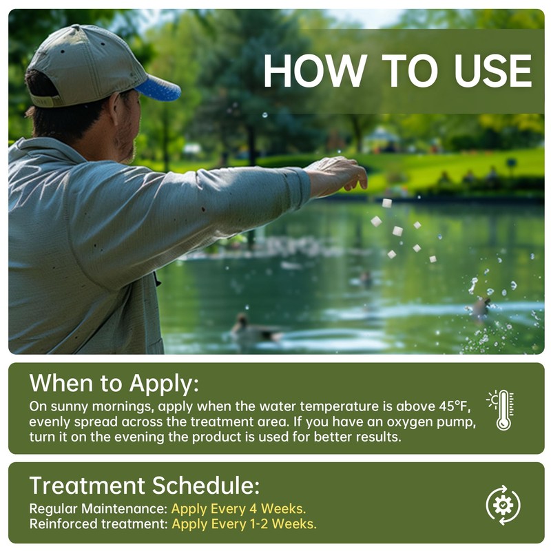 - How to Use: Each pound treats up to 12,500 gallons. For optimal results, spread evenly over the treatment area on a sunny morning when the temperature is above 45°F. It will gradually improve water conditions over time
