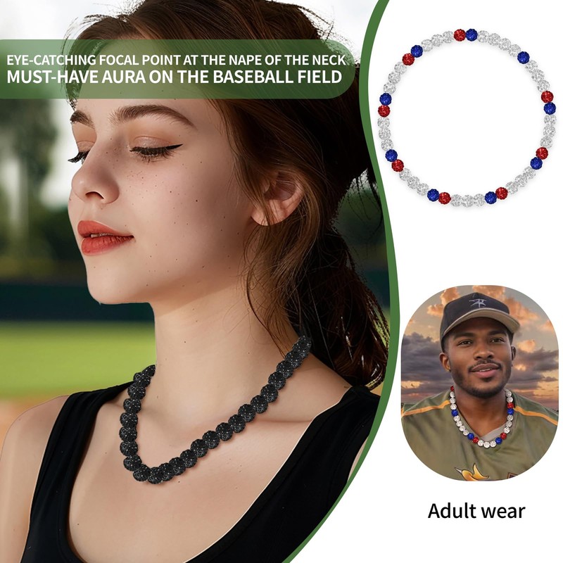 - Baseball necklace: This baseball necklace is inspired by the sport of baseball, combined with the cohesion and teamwork spirit of baseball players crafted, strung with beads to symbolize a whole team, giving people an inspiring feeling. This is more than a necklace, it is an interpretation of the athletes' love and support for baseball. Baseball Necklaces is encrusted with sparkling rhinestones to add just the right amount of sparkle to any outfit, on or off the field!