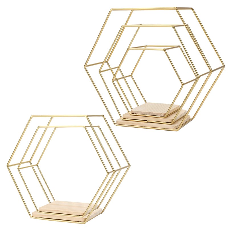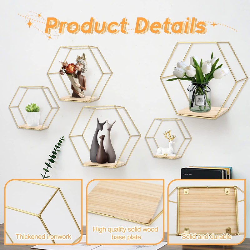 LMYDIDO Set of 5 Hexagon Wall Shelves, Hanging Shelves, Metal and Wood Floating Shelves, Wall Storage Organiser for Kitchen Shelf, Bathroom, Bedroom, Wall Decoration (Gold-5pcs)