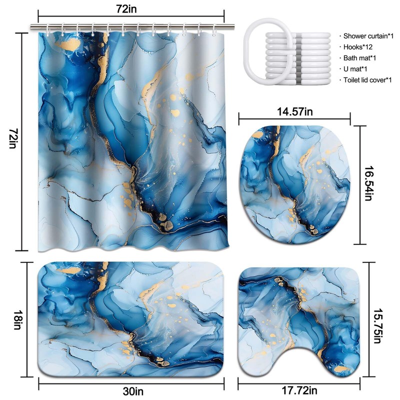 - [The Blue Marble Shower Curtain Set Includes] 1 Blue Marble Shower Curtain with 12-pack Hooks, 1 Bath Mat, 1 Contour Mat, 1 Toilet Lid Cover.This bathroom sets size is suitable for most bathrooms.