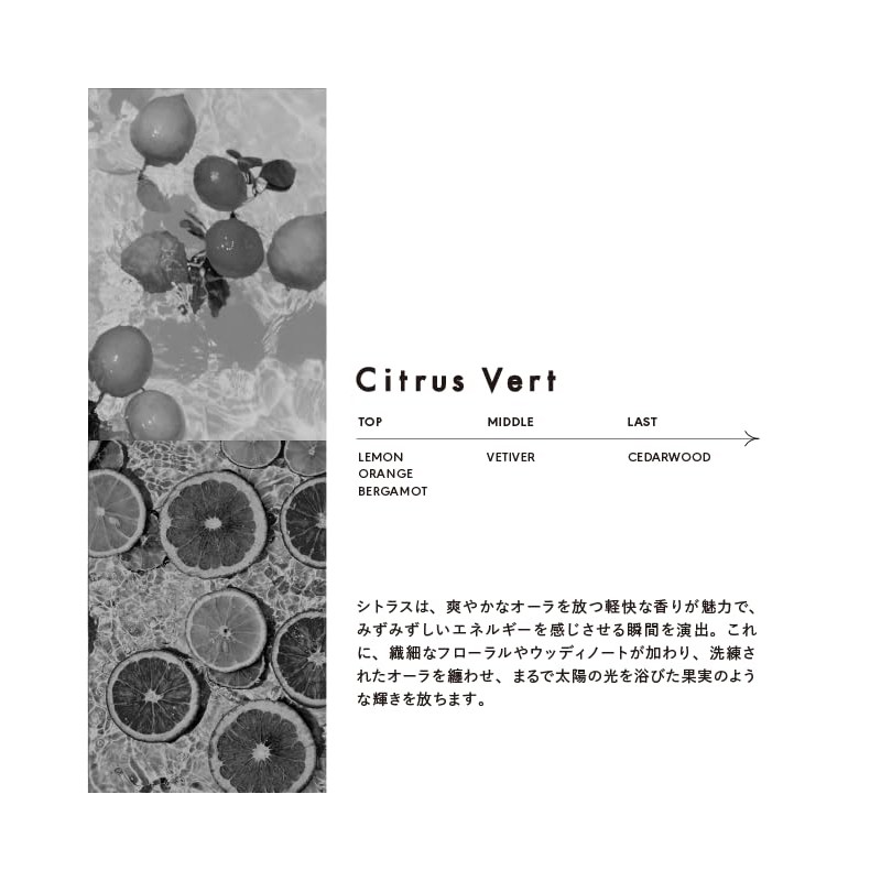 - Citrus Vert: The light scent emits a refreshing aura to create a moment that creates a refreshing energy. Adding delicate floral and woody notes, the aura of sophisticated and sophisticated, it shines like fruit in the sunshine