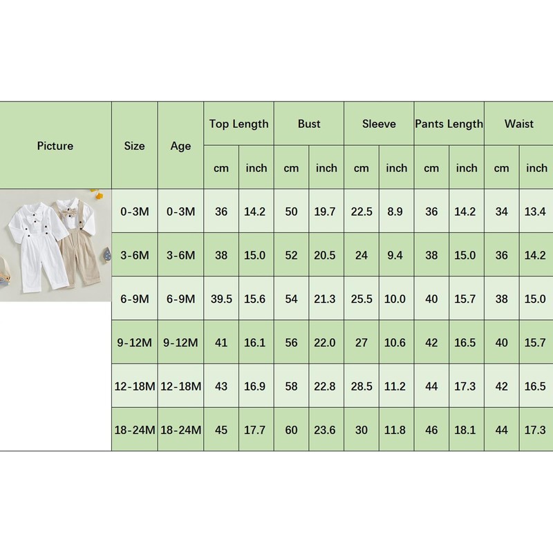 0-3M Tops Length: 14.17 Bust: 19.68 Sleeve: 8.86 Pants Length: 14.17 Waist: 13.39 Advised Age: 0-3 Months