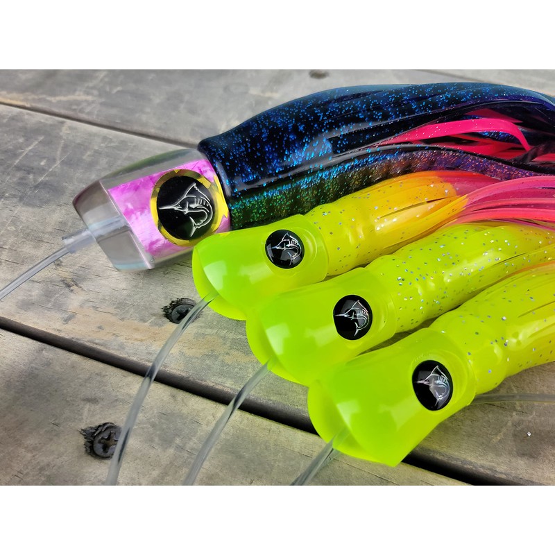 THE CHAIN: Built using 9" UV Mack Skipjack Lures, 5" Glow Bird and a 12" Pelagic Magic. Our lures are manufactured here in the USA using the highest grade urethanes on the market. This means a durable head that wont crack when hitting the deck!