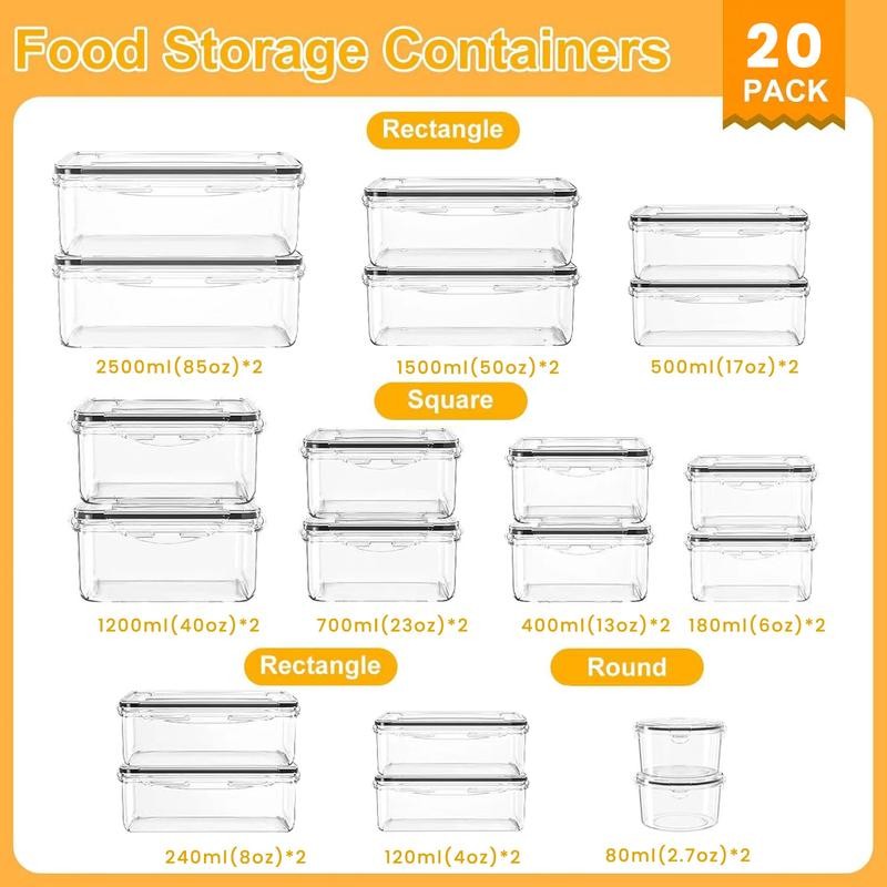 Includes 20 containers and 20 lids of varied sizes, and 2 pieces of Labels & 1 washable marker pen. To match different storage needs, this set includes 10 rectangular containers (2*85 oz, 2*50 oz, 2*17 oz, 2*8 oz, 2*4 oz), 8 square containers (2*40 oz, 2*23 oz, 2*13 oz, 2*6oz), and 2 round sauce boxes (2*2.7 oz).
