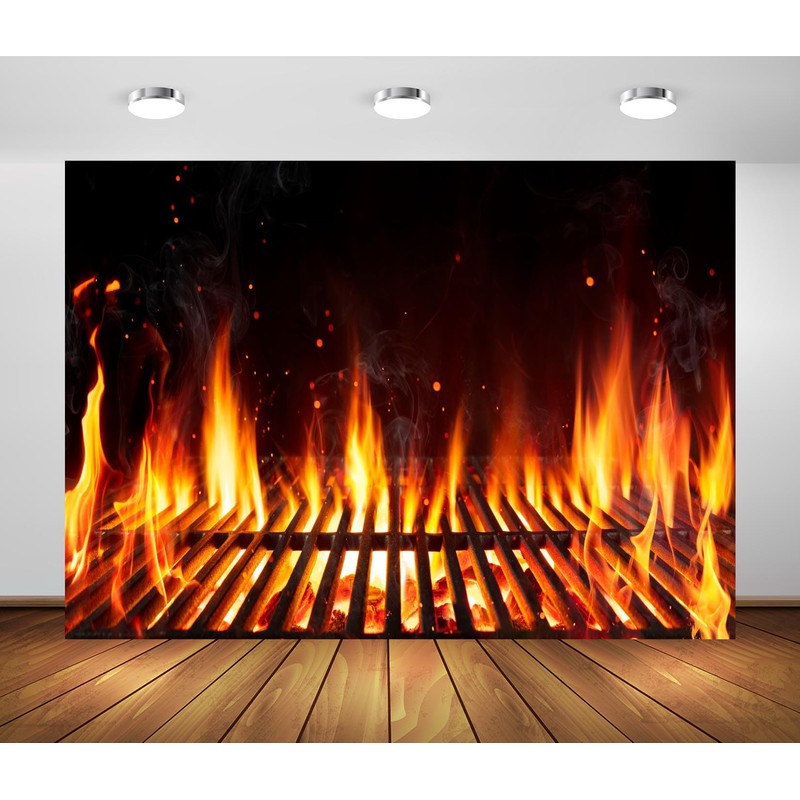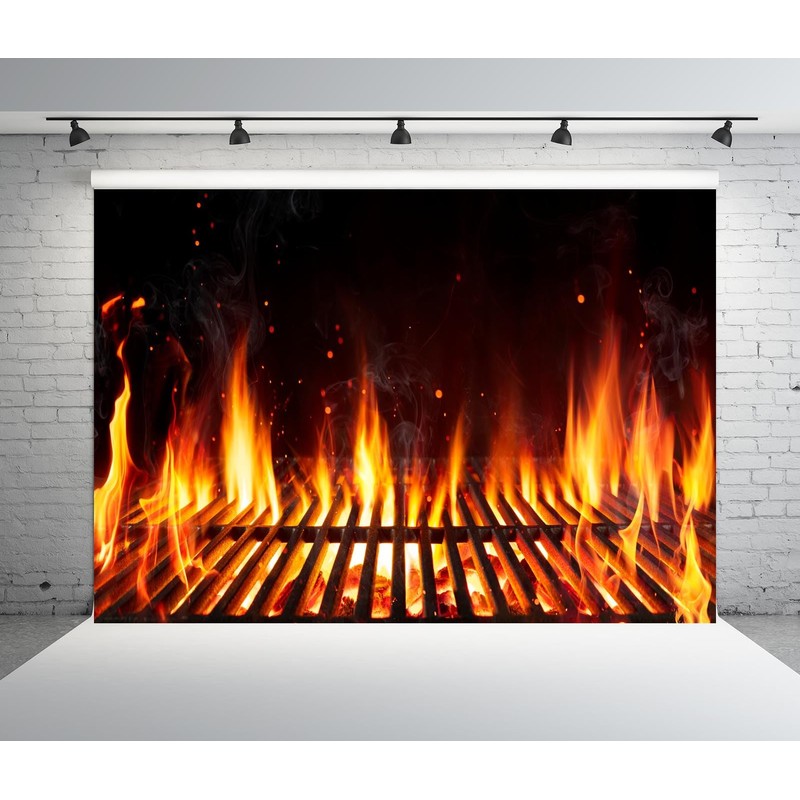 Loccor 7x5ft Fabric Barbecue Grill with Fire Flames Backdrop Empty Fire Grid Fire Flaming Background for Outdoor Camping Picnic Theme Party Decorations Photo Studio Props