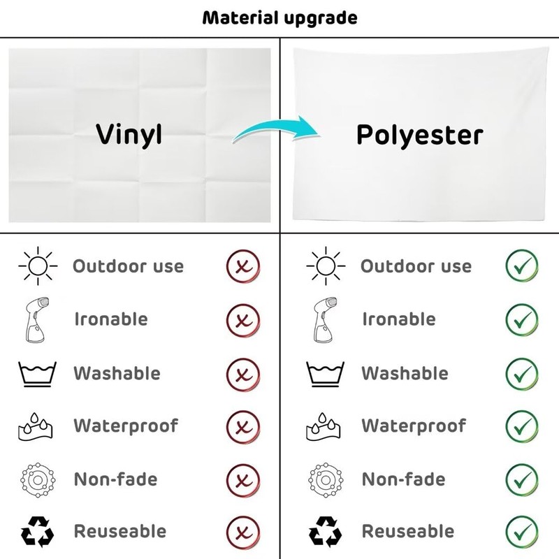 1. Material: Polyester Fabric, it is an upgraded material, compared with vinyl it has washable, ironed, and non-fading advantages.