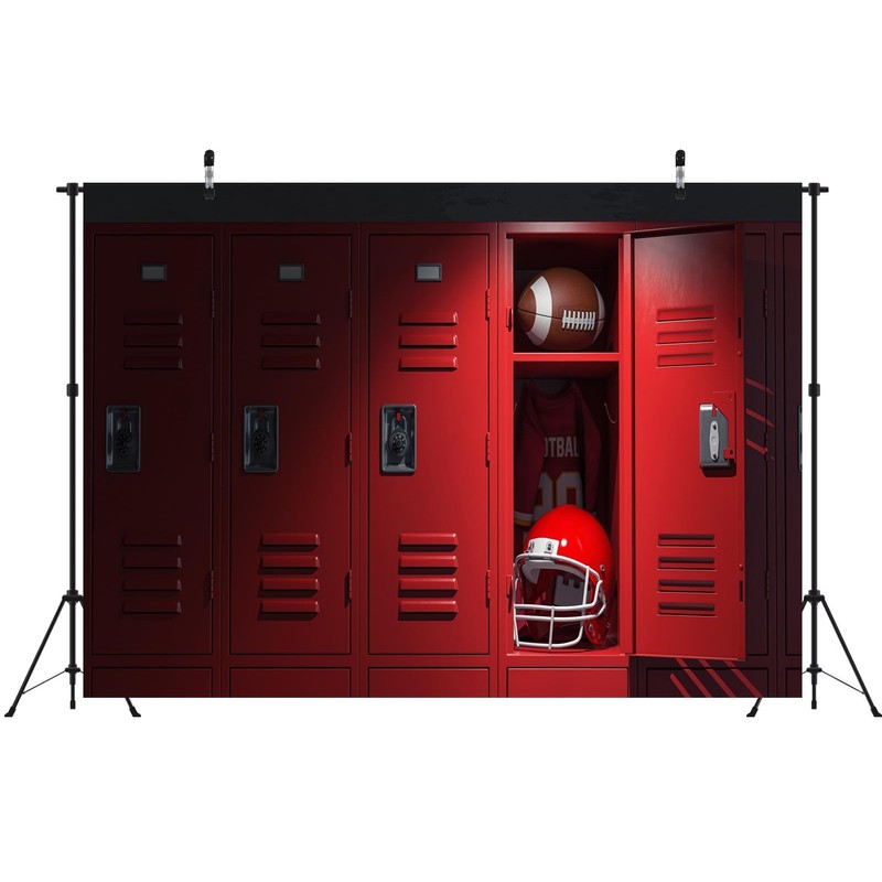 Loccor 7x5ft Fabric Red Locker Room Backdrop American Football Locker Room with Equipment,Ball and Helmet Background Sports Gym School Locker Room Backdrop for Class Photoshoot Props