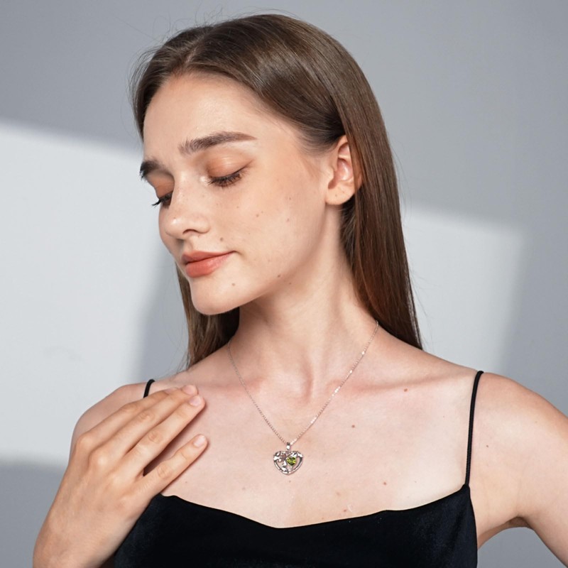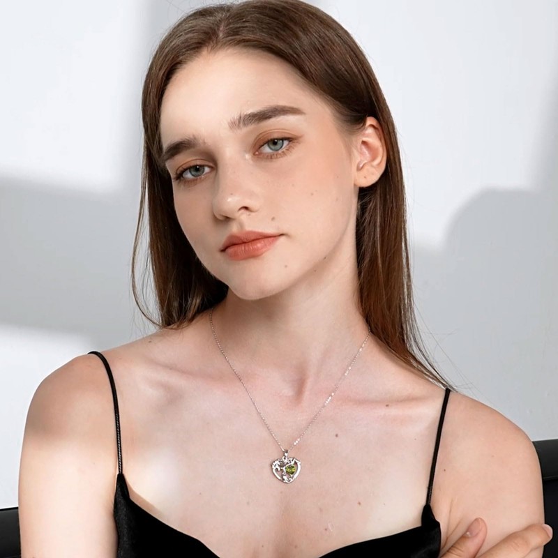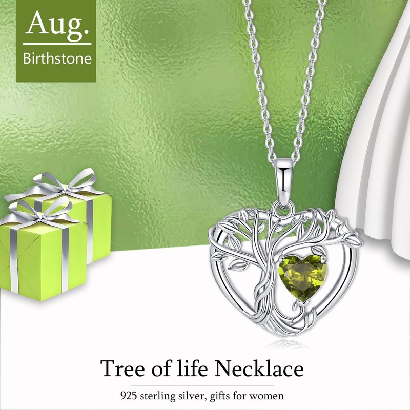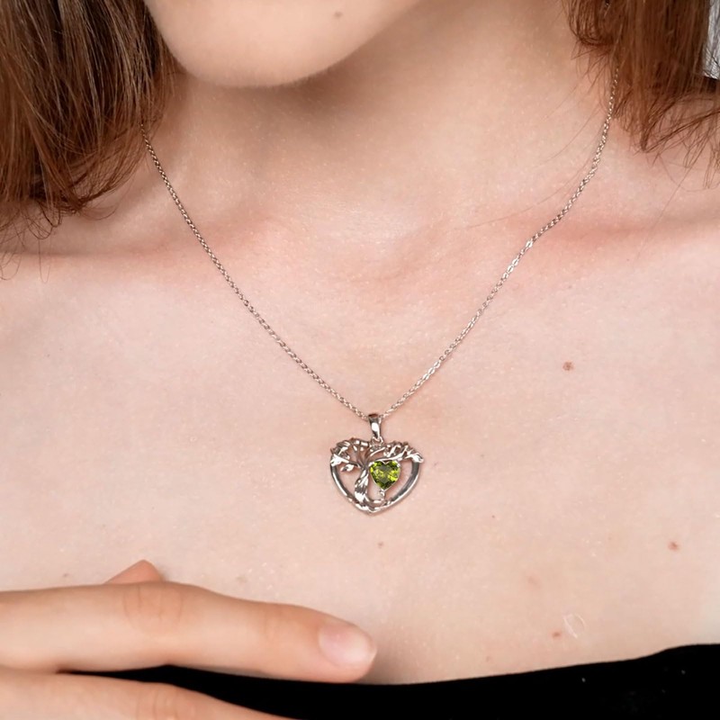 - Birthstone Necklace for Women. This tree pendant necklace features a heart-shaped synthetic peridot gemstone with a precise brilliant cut that allows the stone to sparkle. Peridots represent happiness and harmony in August. This light green gemstone necklace with its beautiful symbolism can be worn with any outfit for a sophisticated and elegant look.