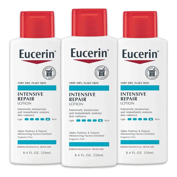 Eucerin Intensive Repair Body Lotion is clinically proven to restore and repair very dry, rough, and flaky skin. Its triple-action formula exfoliates gently, deeply hydrates, and strengthens the skin’s natural barrier, providing long-lasting comfort without fragrance.