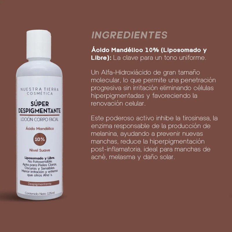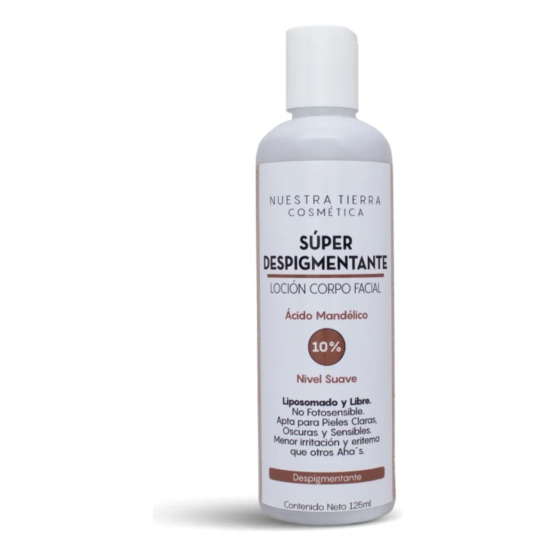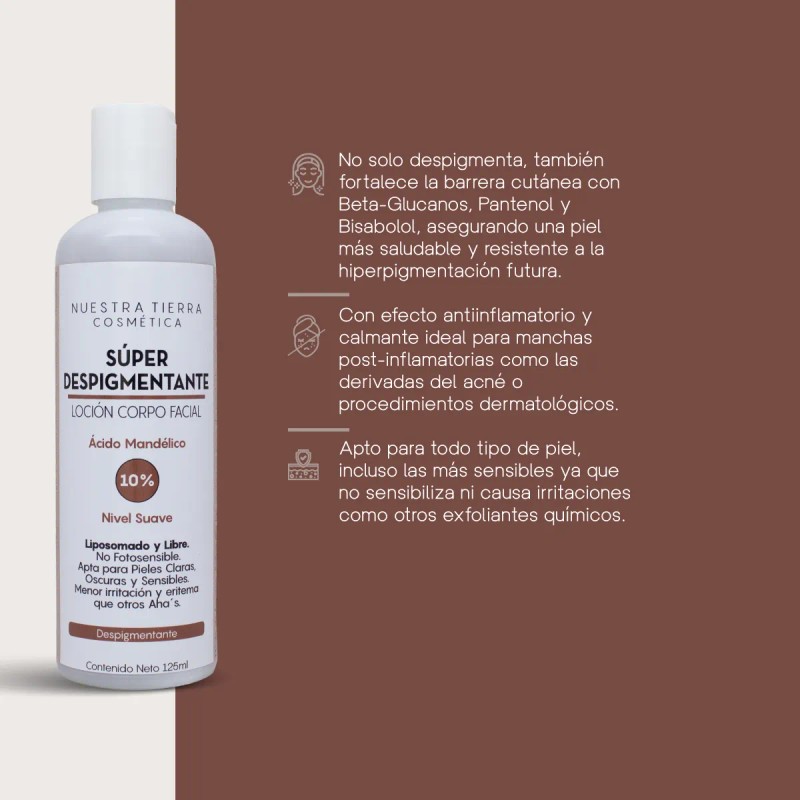 La Loción Super Despigmentante con Ácido Mandélico 10% es una solución nocturna para aclarar manchas en axilas y rostro, siendo ideal para todo tipo de piel gracias a su acción exfoliante suave y despigmentante. Recuerda que la protección solar diaria es vital al usar este producto. Si tienes dudas, ¿te gustaría saber cómo incorporar un despigmentante en tu rutina de skincare?