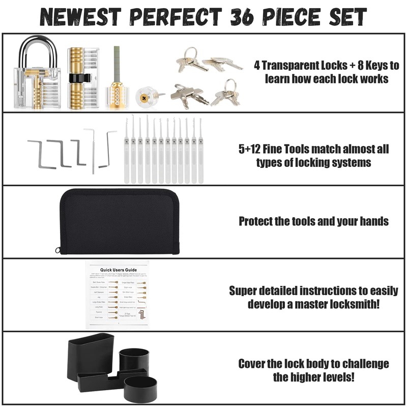 - 【Package Includes】36 sets to meet the various tools and accessories required to practice. It contains 4 transparent padlocks and 8 keys, 12 lock picking tools, 4 tension wrenchs, 4 transparent lock boxes and 4 black rubber sleeve.