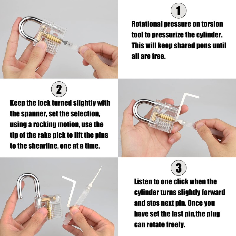 - 【Quality Upgraded】The handle of the lock picking tool is upgraded to blue anti-slip silica gel for comfortable grip. The lock unlocking part is made of high quality, smooth stainless steel and will not scratch your fingers. Transparent padlock adopts high purity plastic, no impurity and particle sense. Precision lock core, hundreds of thousands of times to pry without loosening off, to meet your endless practice lock needs.