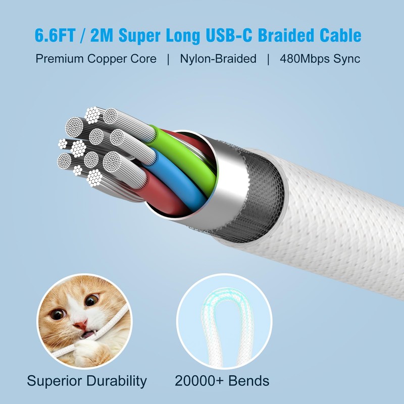 - 2M / 6.6FT USB C to C Braided Cable: super long cable let you can charge and work anywhere; made of top-rated thicker copper wire and coated with premium seamless braided nylon, tested with over 20000+ times bend to provide 4 times longer lifespan, support 480Mbps data syncing.