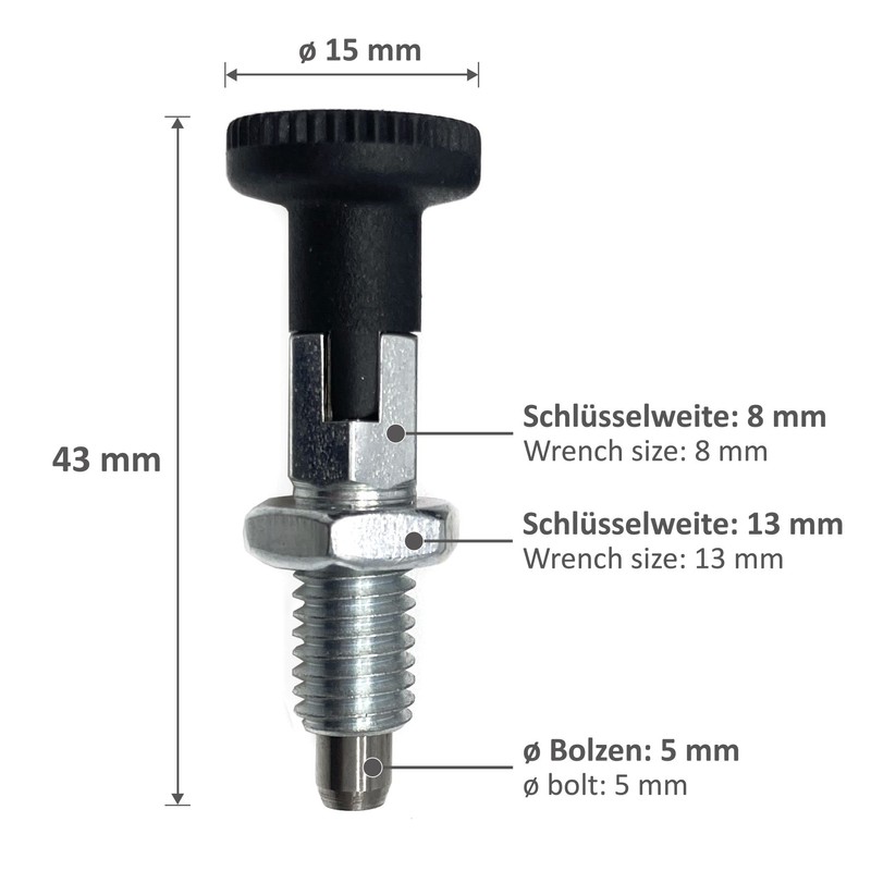 Two pieces locking bolts M8 x 15 mm, spanner width 8.0 mm, locking bolt diameter 5.0 mm.