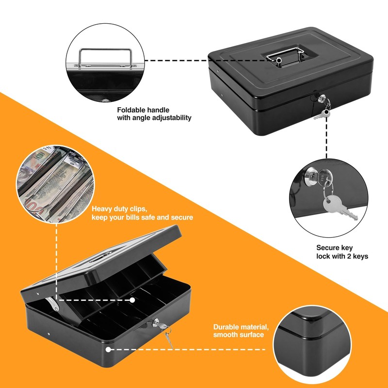 - UNBREAKABLE PROTECTION: Designed to withstand the toughest conditions, our heavy-duty cash box can handle drops and impacts without compromising security. Equipped with a unique lock and exclusive keys, you can rest assured that only authorized individuals have access, adding an extra layer of protection