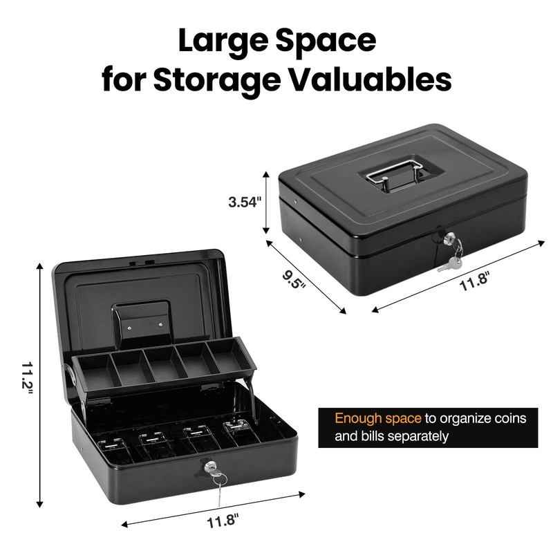 - SPACIOUS STORAGE: Our cash box offers ample space to store all your valuables, measuring 11.8"L x 9.5"W x 3.5"H. From important documents to jewelry, watches, and cellphones, everything can be securely stored. The convenient carrying handle makes it perfect for on-the-go security
