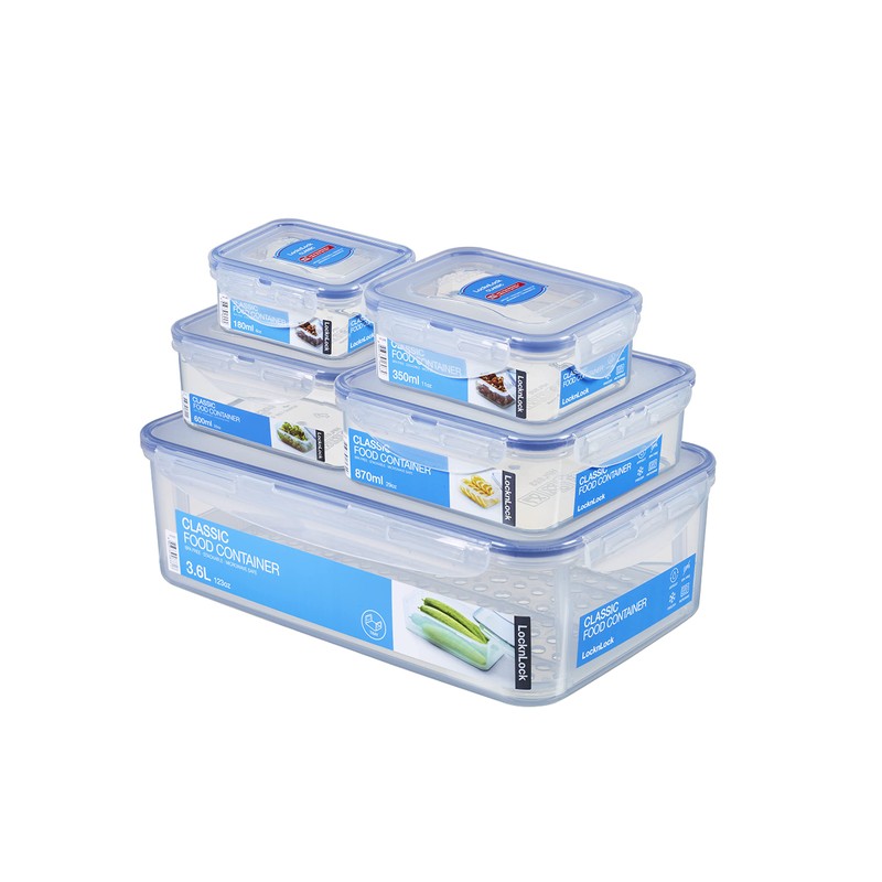 LocknLock PP Classic Vorratsdosen Set, 5-teilig, 180 ml, 350 ml, 600 ml, 870 ml, 3,6 l, 100 % luft- und wasserdicht, Cleveres Verschluss-System, Frischhaltedosen Kühlschrank & Gefrierfach