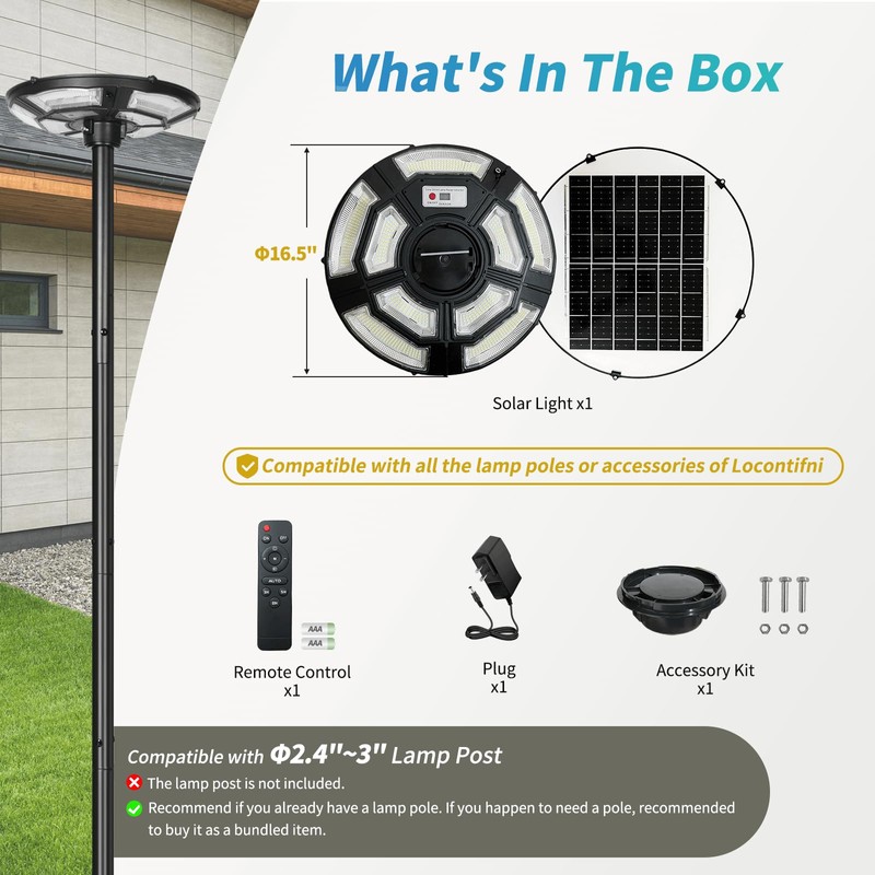- Upgraded Lighting Visibility: The Locontifni Solar Post Light has a 16.5'' diameter and features 750 high-lumen LEDs to illuminate up to 2,000 square feet. The outdoor pole lights shine in 360° omnidirectional light, offering bright, natural illumination that improves safety in dark outdoor corners (recommended for mounting on top of a 10' lamp pole). Ideal for any area needing lighting, including parking lots, garages, backyards, porches, gardens, pathways, driveways, barns, warehouses, and more